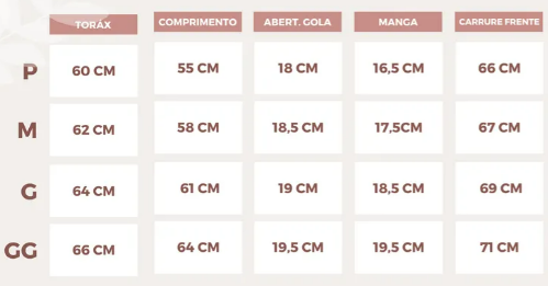 Tabela de medidas: