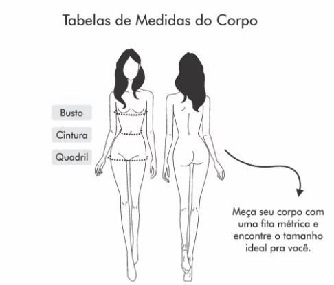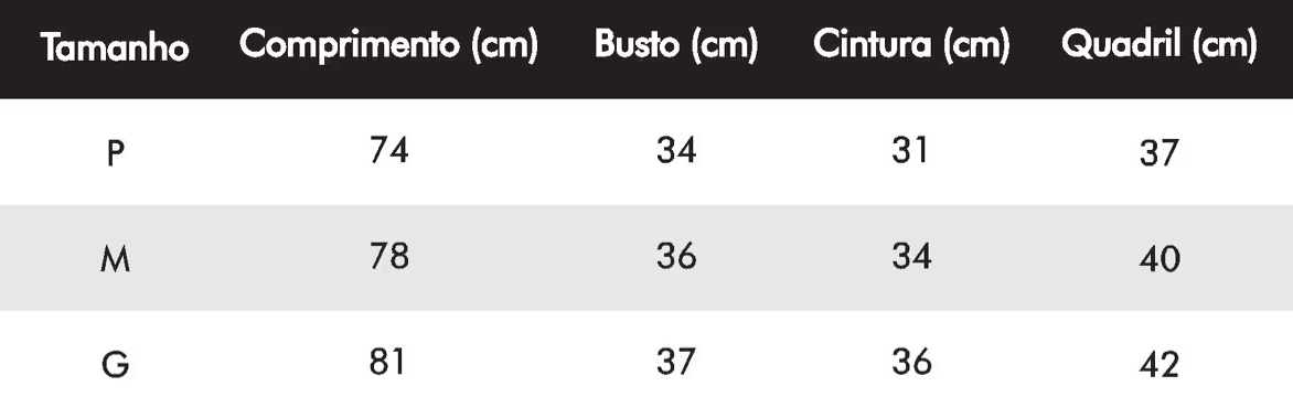 Medidas da modelo: altura 1,70m | busto 90cm | cintura 66cm | quadril 94cm