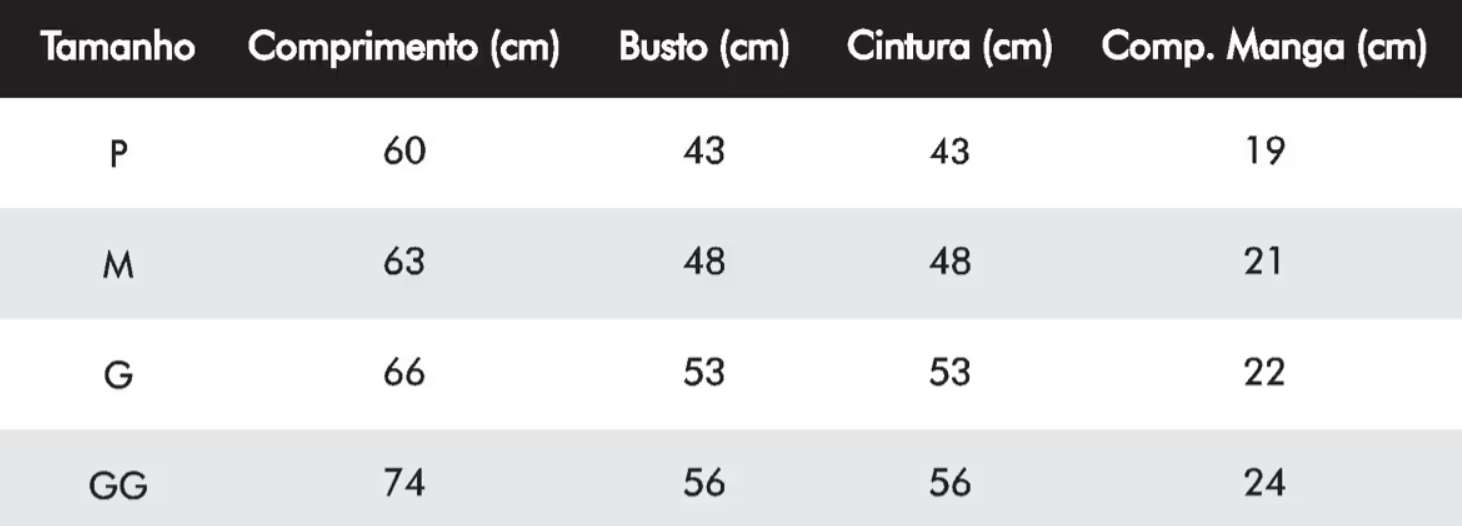 GG Comprimento 74cm | Busto 56cm | Cintura 56cm | Comprimento manga 24cm | Abertura manga 18cm | Ombro 14cm