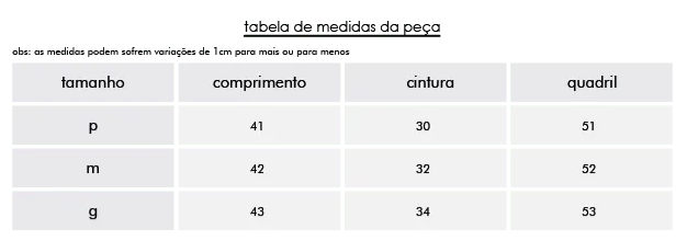 Tabela de medidas: