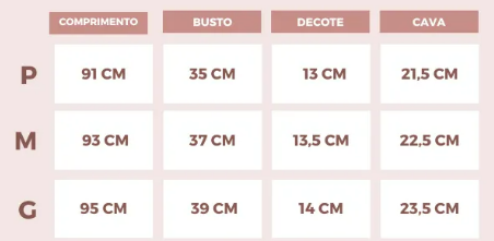 Tabela de medidas: